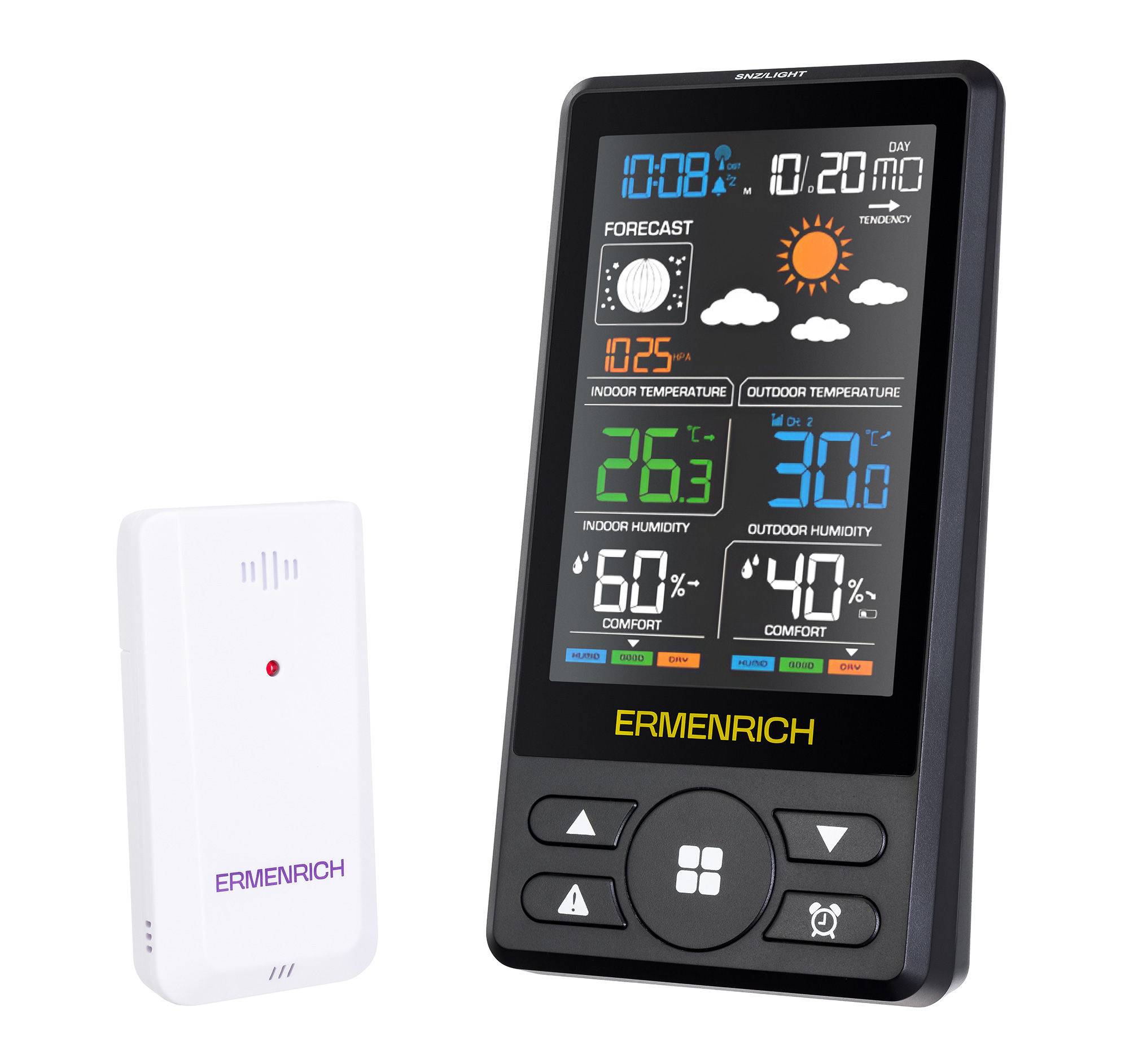 Метеостанция Ermenrich Report WR50 – компактное устройство в стильном дизайне, которое используется в домашних условиях для оценки микроклимата в помещении и изучения погоды на улице. Оно комплектуется беспроводным внешним датчиком, который можно закрепить на стене, дереве или заборе на расстоянии до 80 метров от основного модуля.